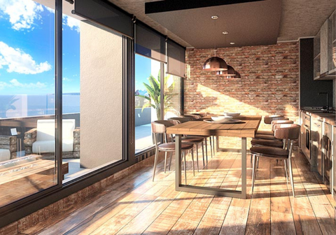 Living, comedor, cocina y dormitorio con piso SPC flotante (repelente al agua). Ventanas termopanel con marco de PVC antracita.